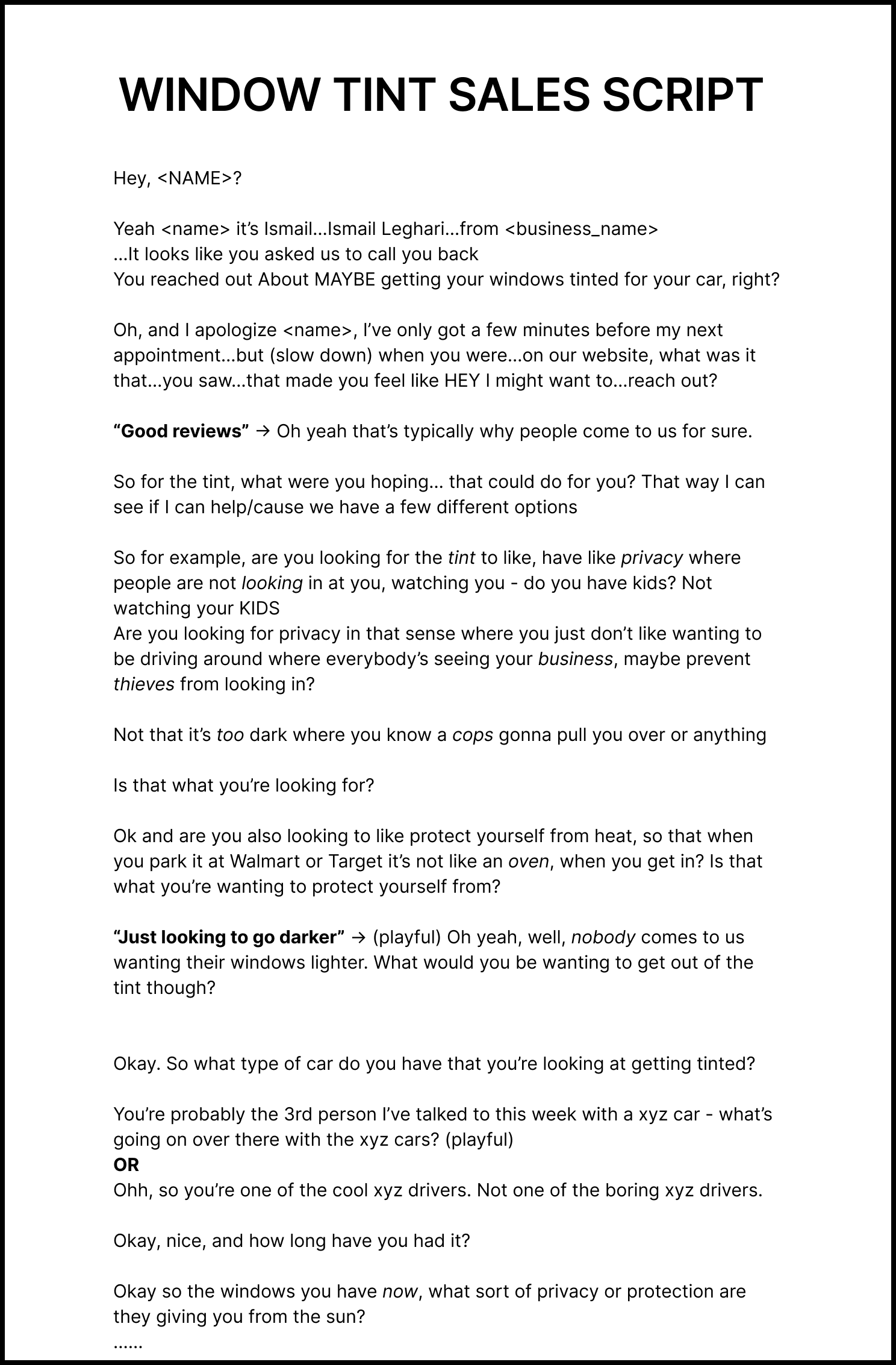 A tint shop in Florida using the sales script to close more jobs - without sounding pushy...