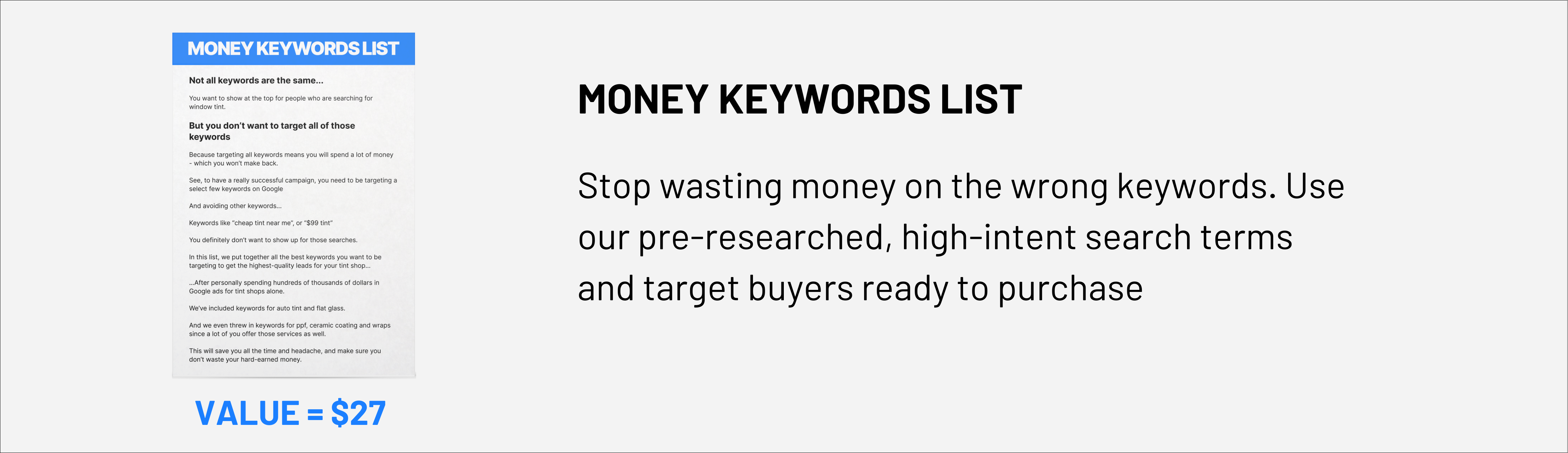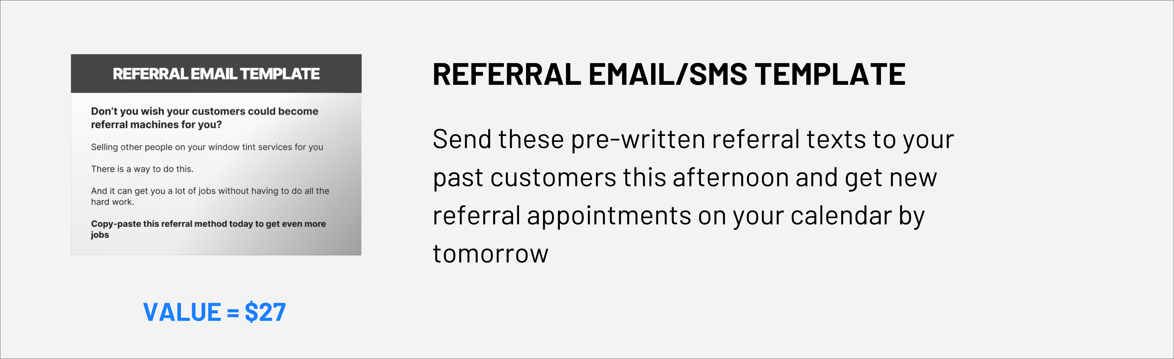 You get ALL the landing page templates… follow-up text messages… sales scripts… revenue calculators… tint package visuals… video scripts… keyword lists… and even referral templates.